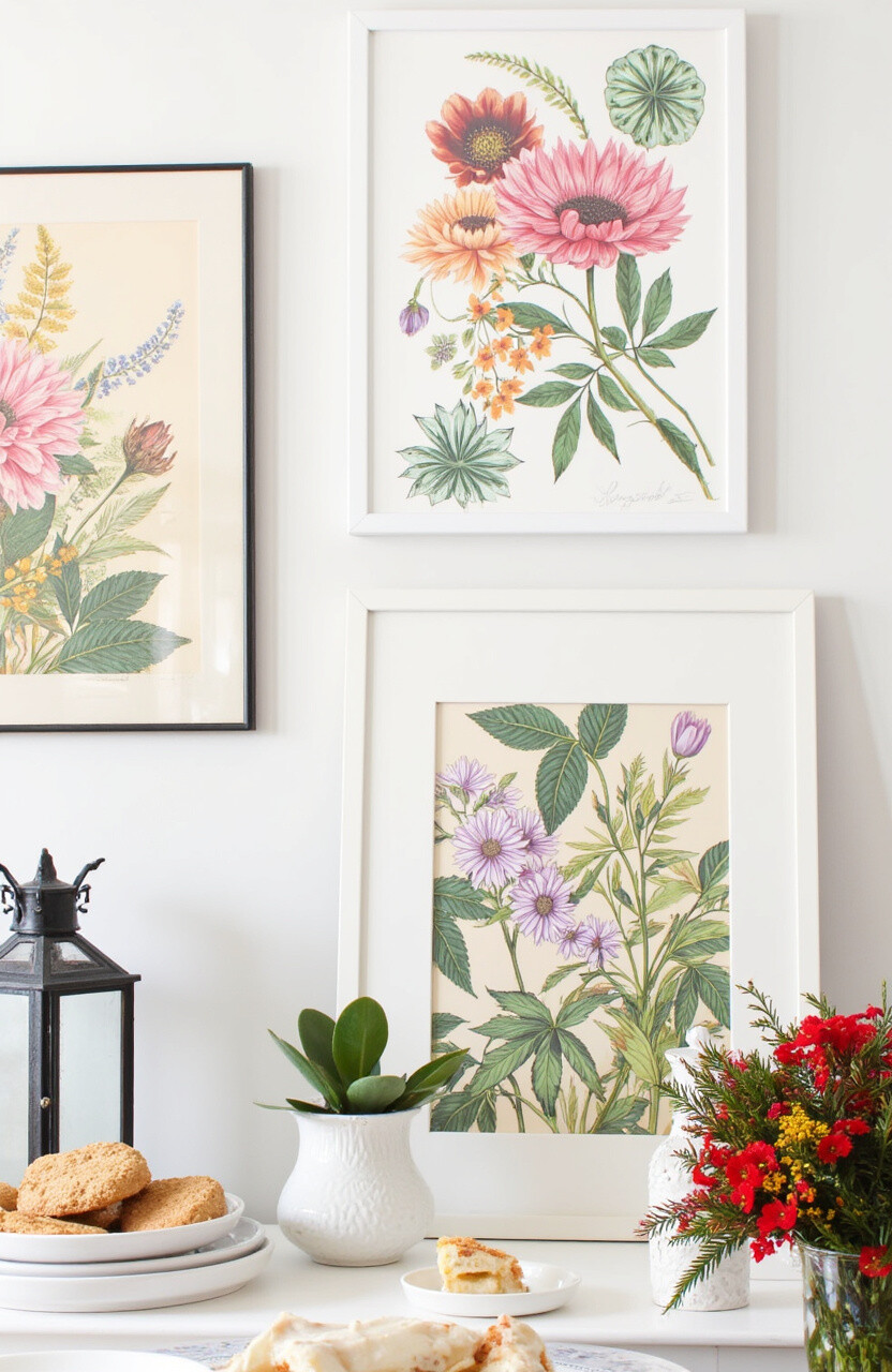 Botanical prints add color and life without the need for fresh flowers. They’re versatile and work well with both modern and traditional styles. This look is affordable and easy to find in home decor stores.
