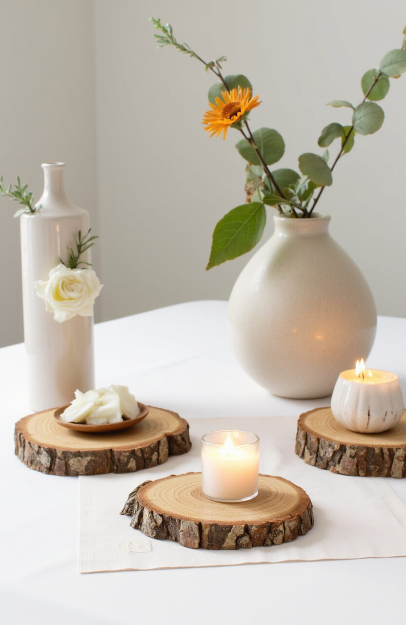 Use rustic wooden slices as a base for candles or small vases. They add a natural, earthy feel to your table, perfect for a cozy dinner in. Each piece of wood is unique, just like your gathering.