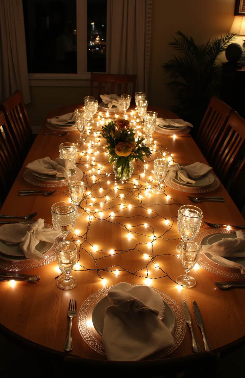 String fairy lights across the table for a whimsical, sparkling effect. It’s like dining under a sky full of stars.