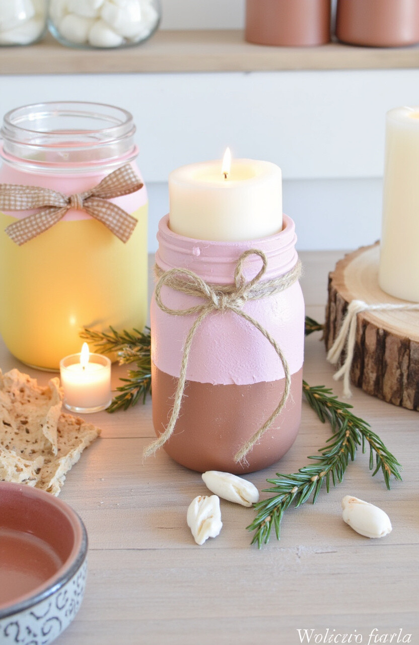 Decorate them with paint, ribbon, or twine to match your theme. It’s budget-friendly and allows you to repurpose items you already have. Light the candles for a cozy, warm glow.