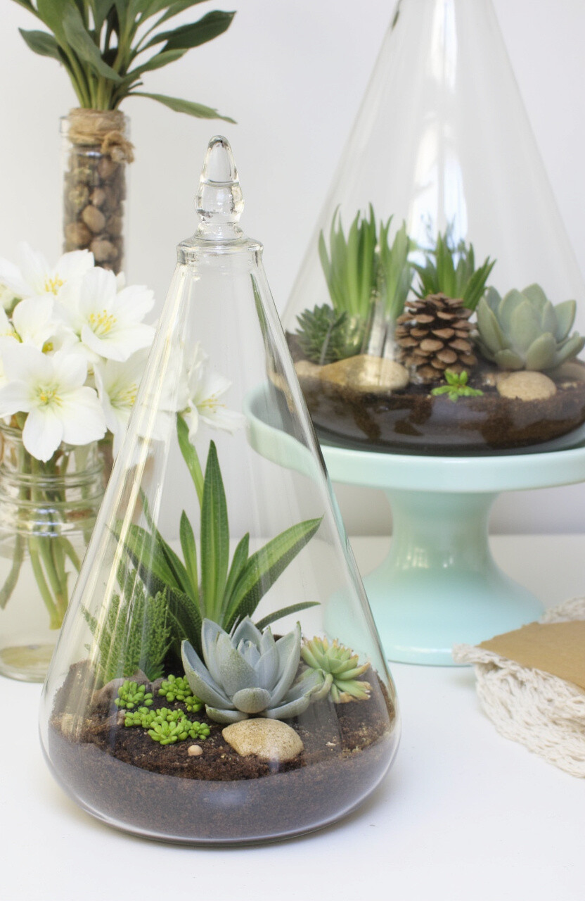 Use small terrariums as centerpieces for an earthy, modern look. They’re like tiny worlds full of life.