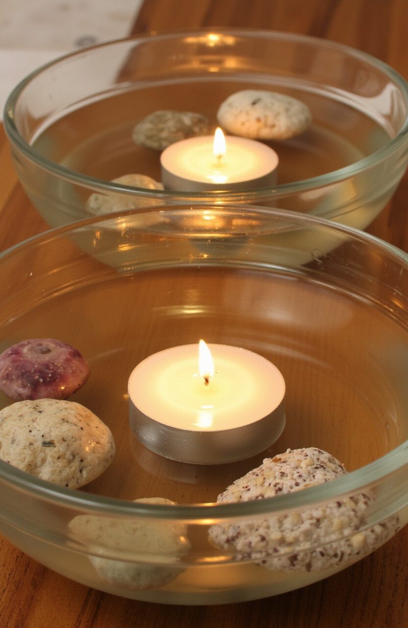 Add flower petals or small stones for extra flair. The light reflection creates a soothing ambiance, and it’s a simple yet elegant option. Reuse bowls you already have, making it a cost-effective choice.