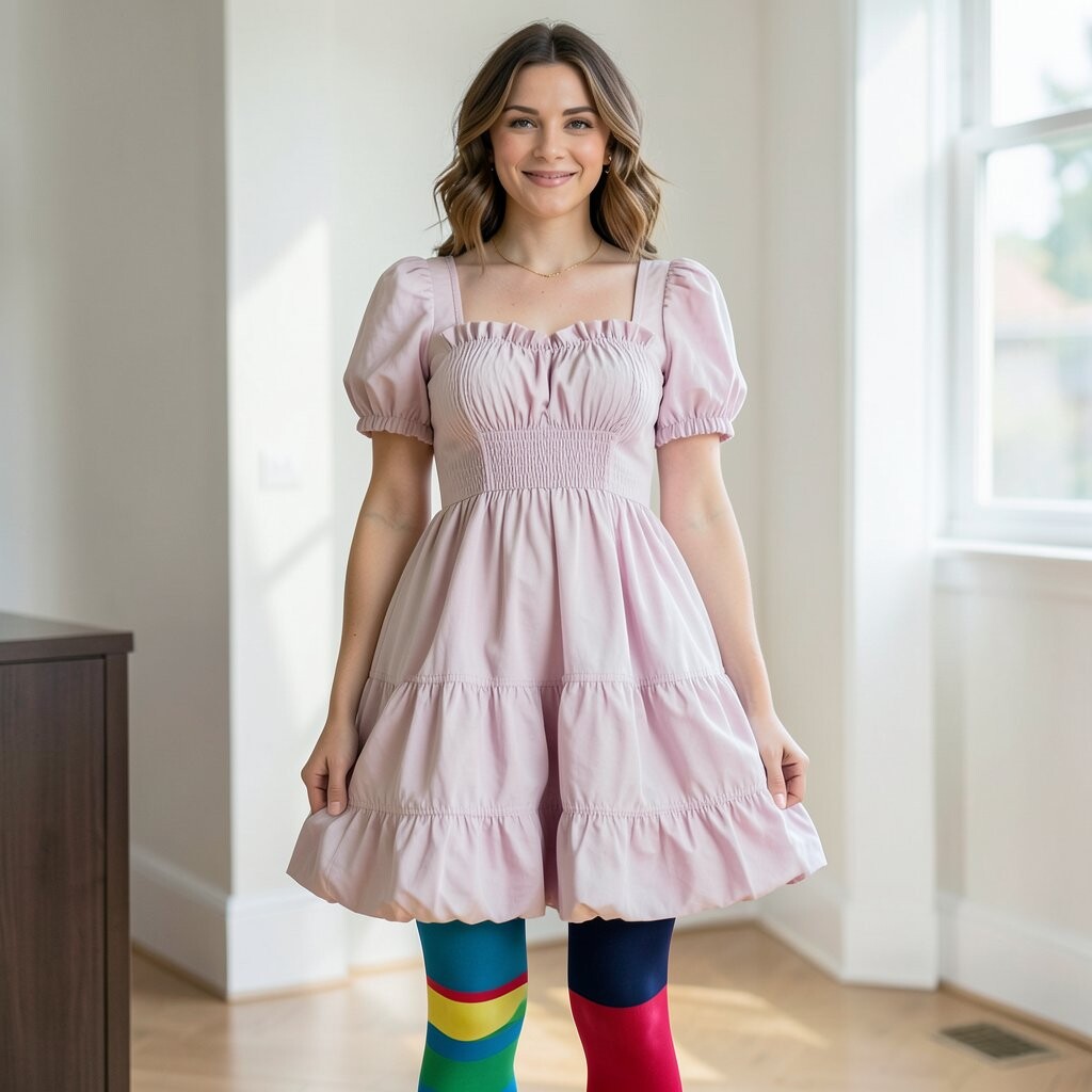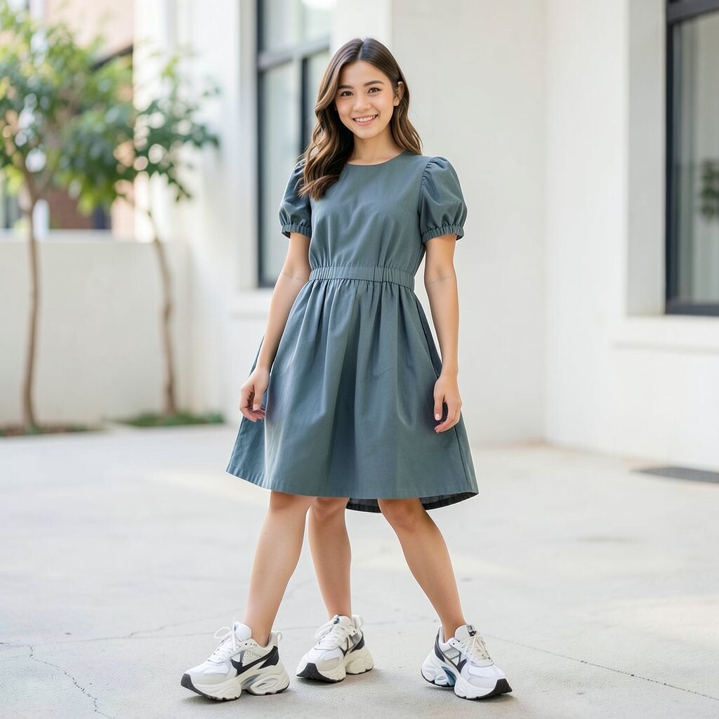 Pairing a puffed dress with chunky sneakers gives it a sporty yet chic vibe. This combination is ideal for a day out shopping or running errands.