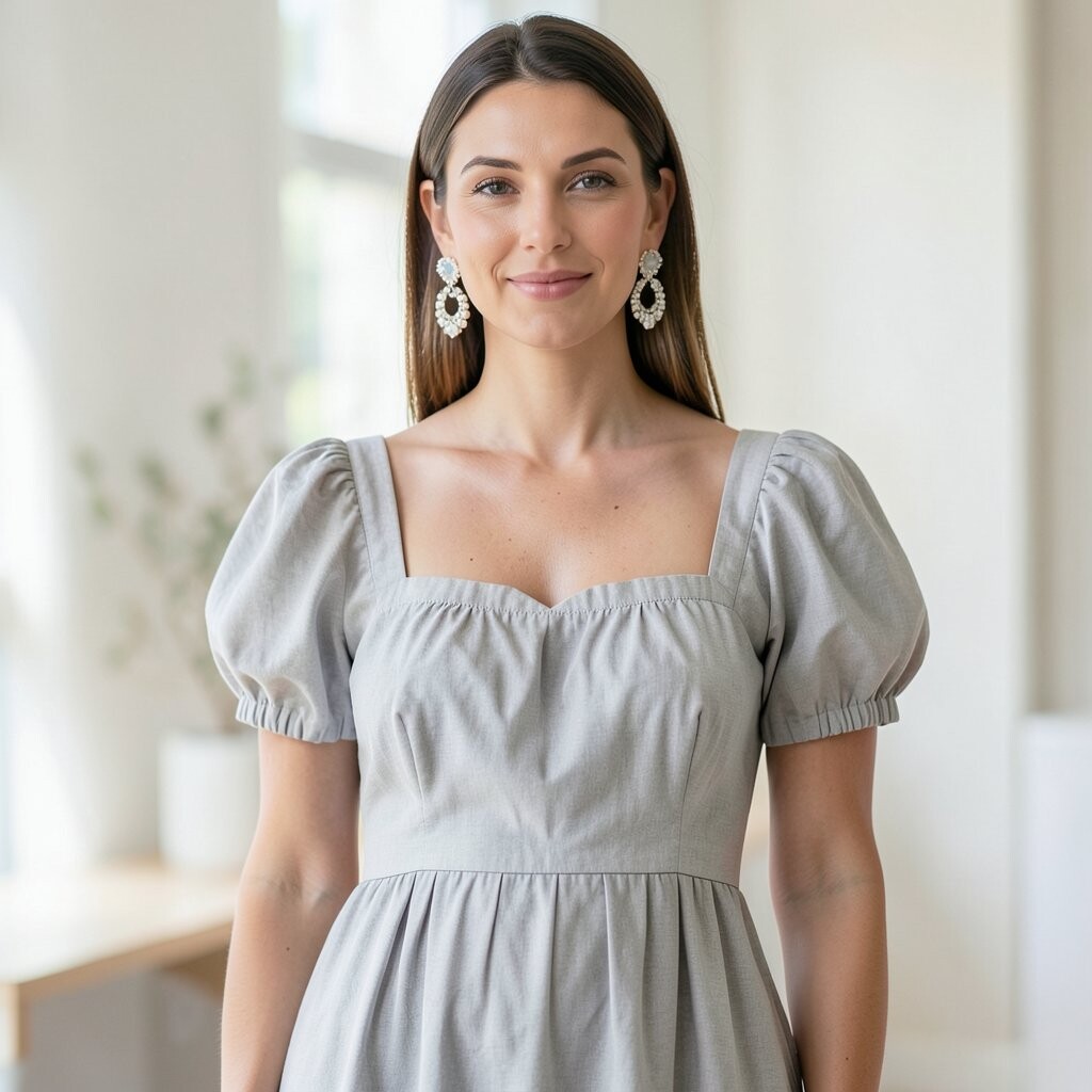 Pair your dress with oversized statement earrings. The contrast between the puffed sleeves and the earrings draws attention to your face.