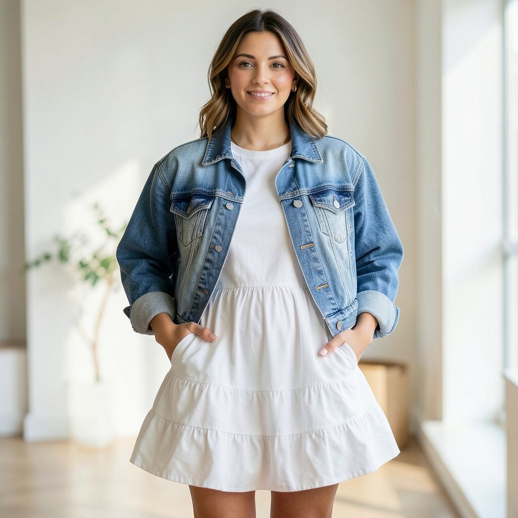 A denim jacket adds a casual touch to your puffed dress. It’s perfect for a relaxed day out with friends.