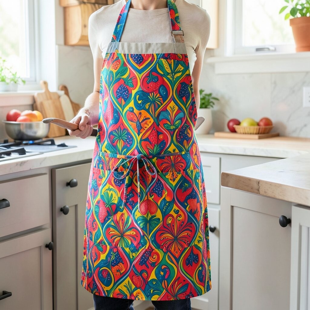 The design adds a dynamic and lively touch to your cooking attire. It’s as if you’re wearing a masterpiece while you cook!