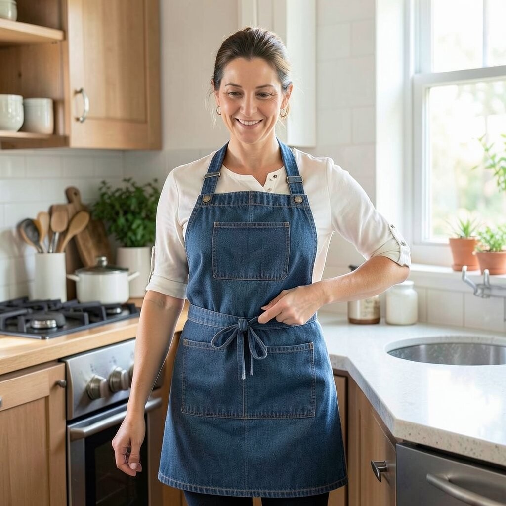 Denim aprons are durable and stylish, perfect for those who love a rugged yet fashionable look. Denim is a timeless fabric that suits both men and women.