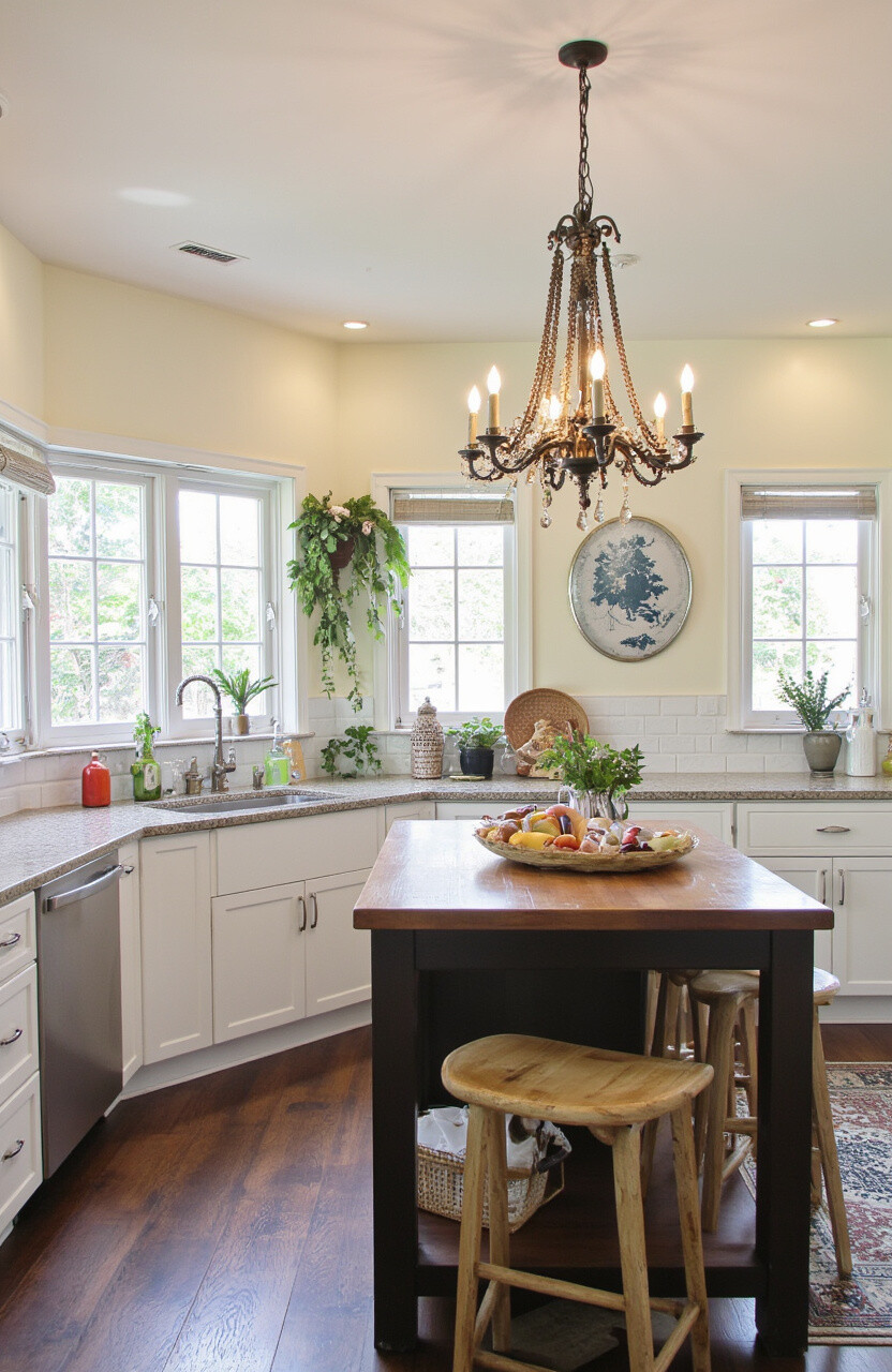 Consider pendant lights with Edison bulbs or retro chandeliers. These can become the centerpiece that ties your kitchen together.