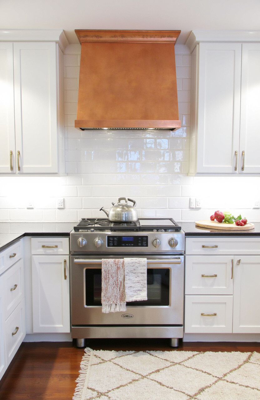 Copper accents bring warmth and shine to a kitchen. They can range from small hardware to larger fixtures like range hoods.