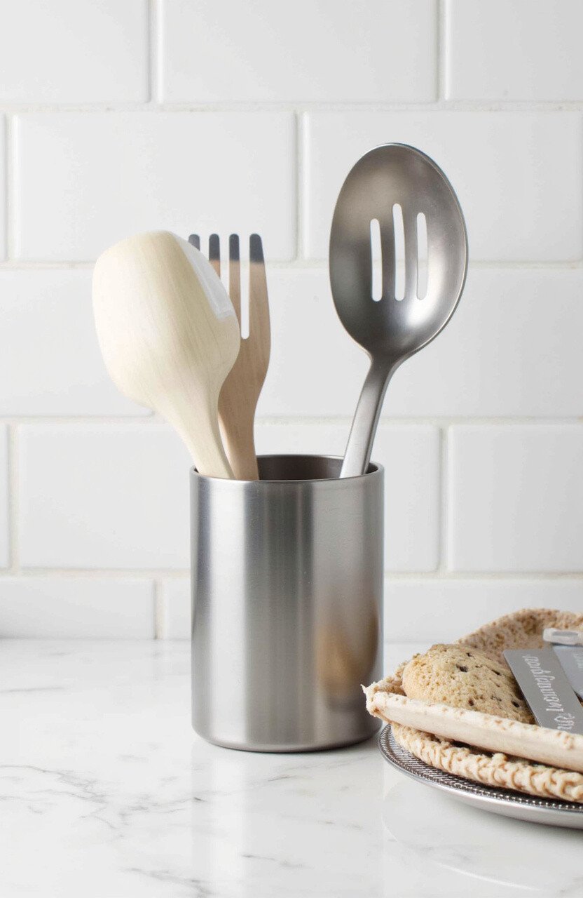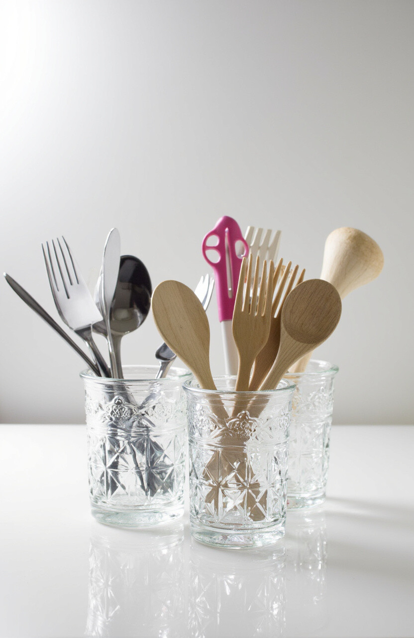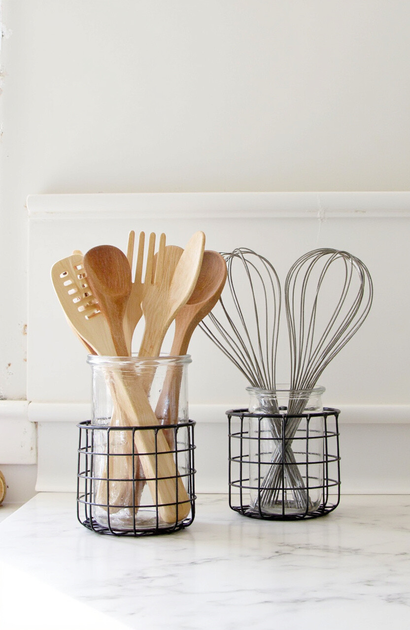 Glass holders are easy to clean and bring a touch of class. They’re perfect for showing off your colorful utensils. Pair with glass jars for a cohesive theme.