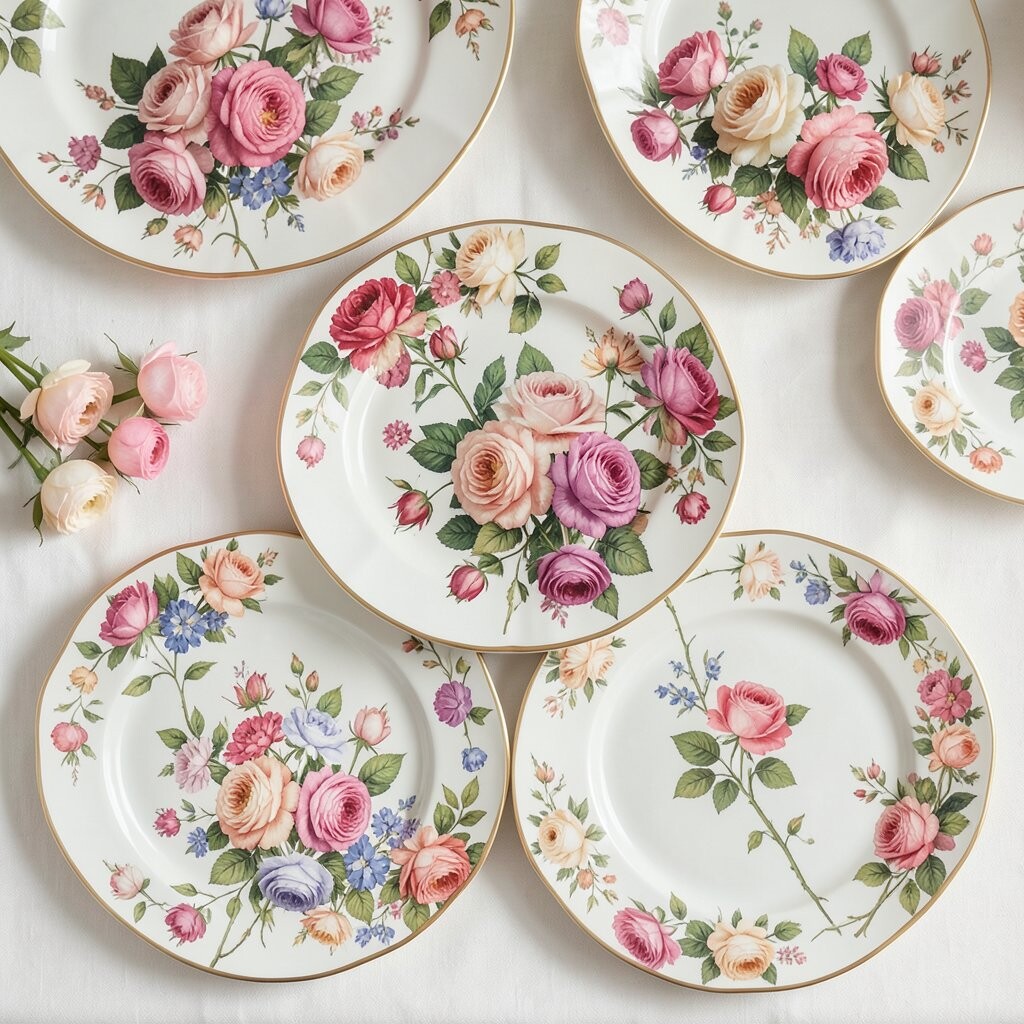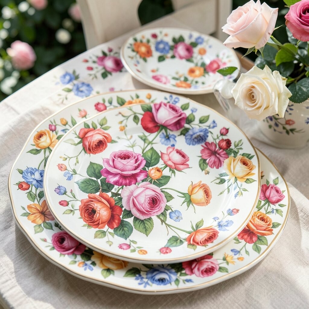 Immerse yourself in a rose garden with plates that feature lush, blooming roses. The rich reds and pinks are perfect for creating a romantic setting.