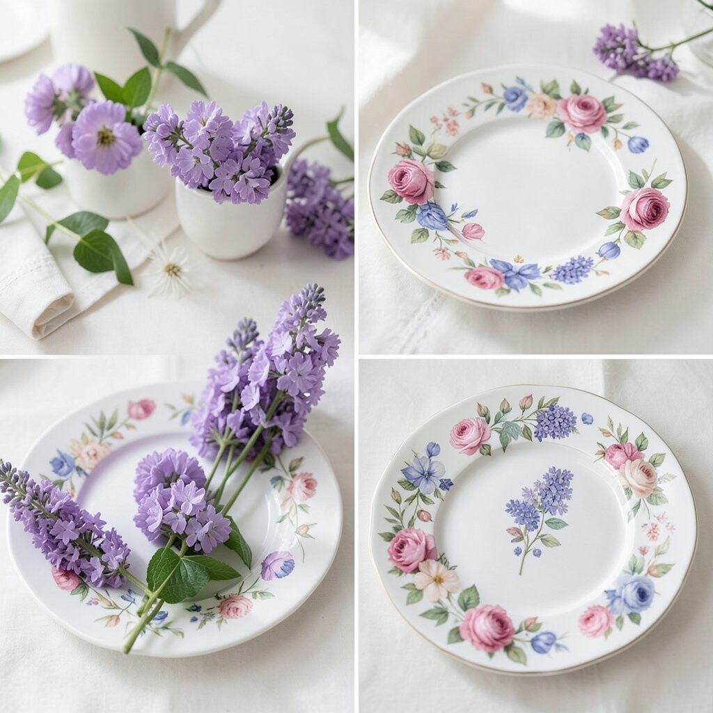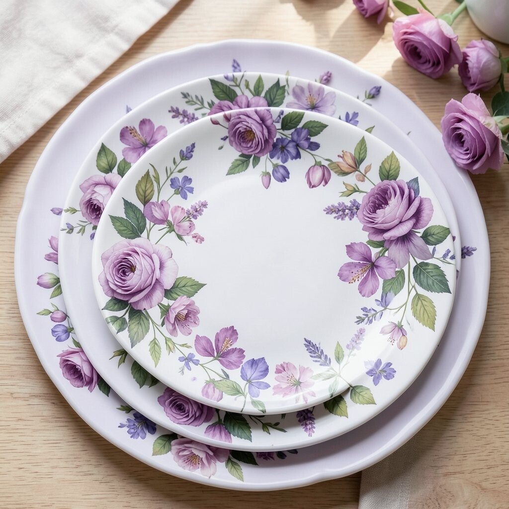 Lilac-themed plates offer a soft and gentle touch to your dining experience. Their pastel purples and greens are calming and chic.