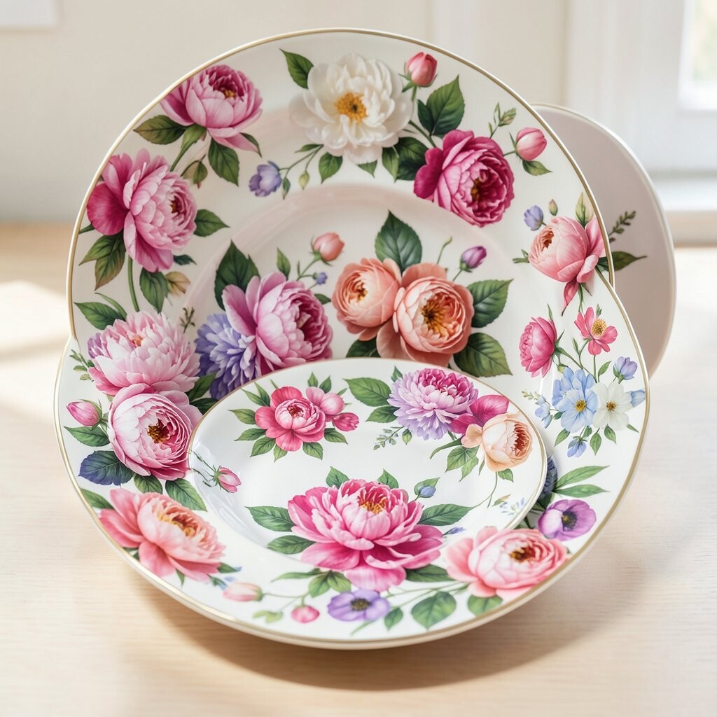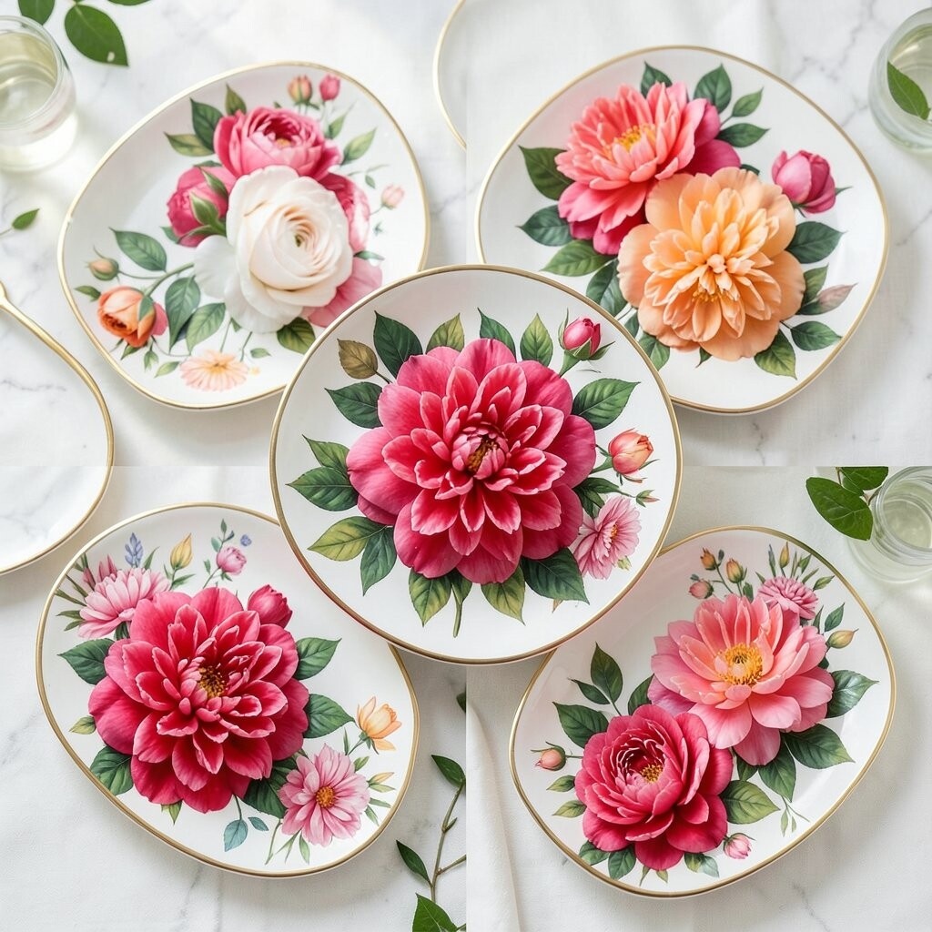 Peonies are lush and luxurious, making peony-themed plates a stunning choice for any table. Their soft pinks and whites can create a romantic ambiance.