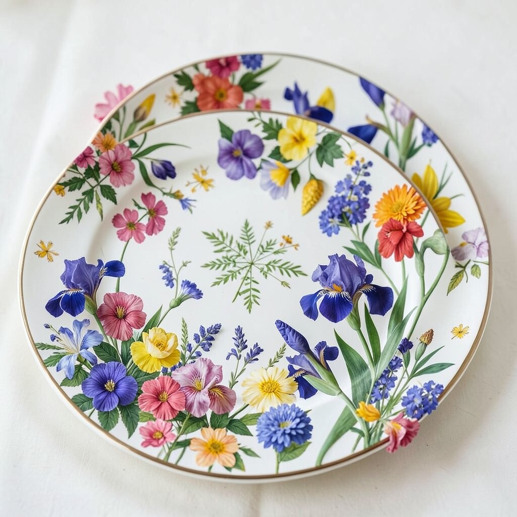 Iris plates are bold and artistic, with intricate designs that capture the beauty of iris flowers. Their deep blues and purples are mesmerizing.