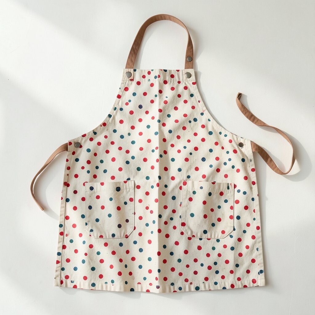 Choose bold colors like navy or red for a striking look. The polka dot pattern is timeless, ensuring this apron never goes out of style. It’s affordable and can be found in most stores.