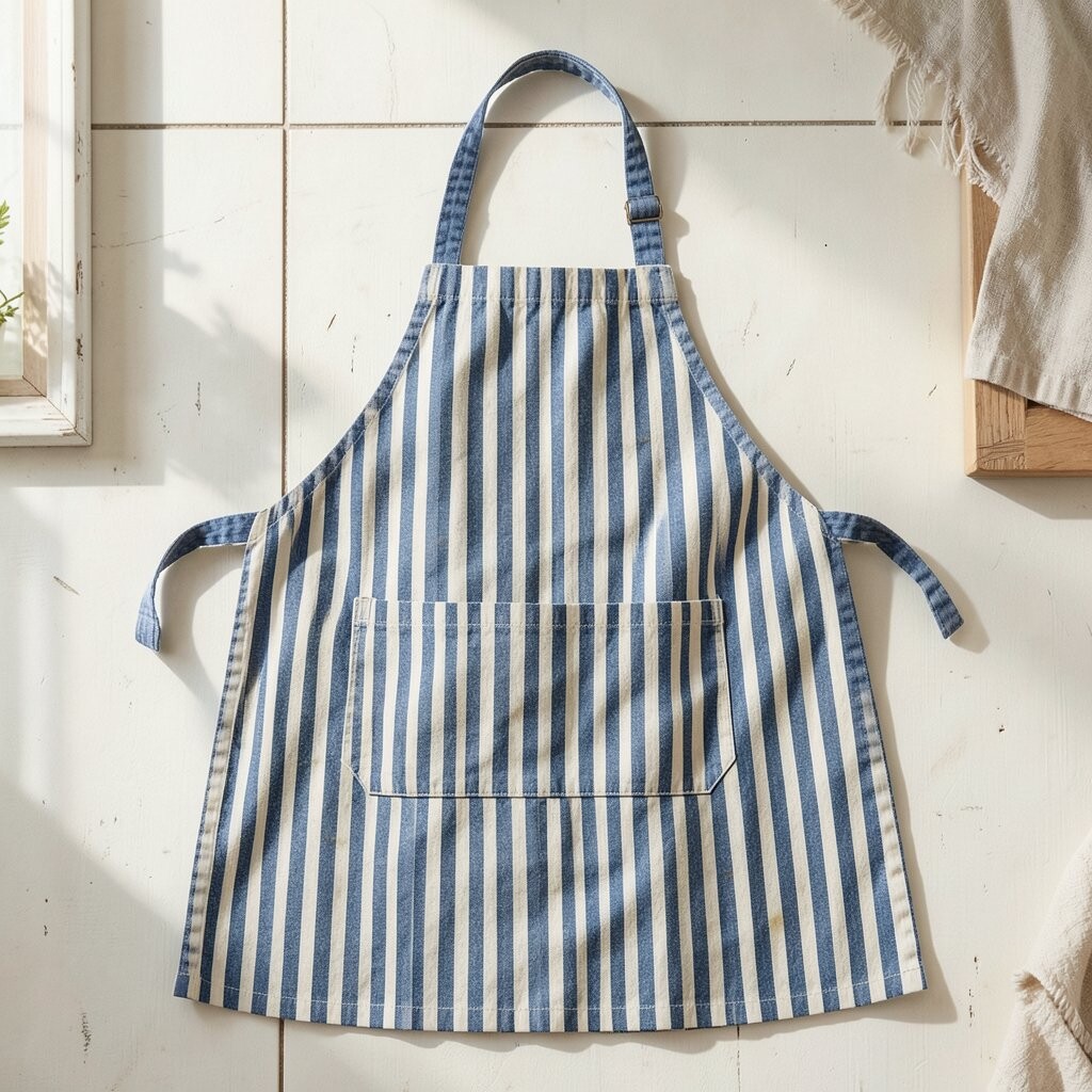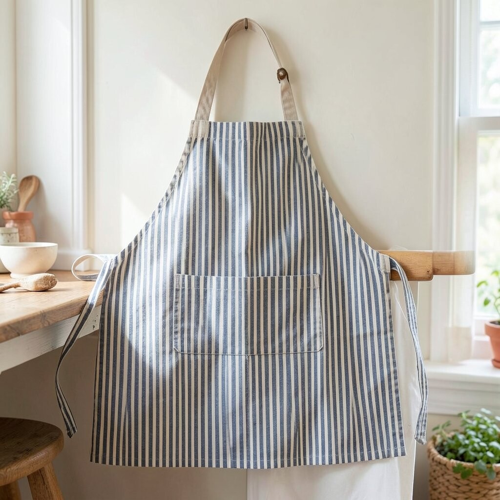 For a touch of elegance, try a striped apron. Its clean lines are perfect for those who love minimalist designs. It’s both functional and fashionable.