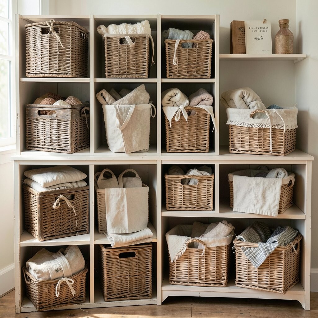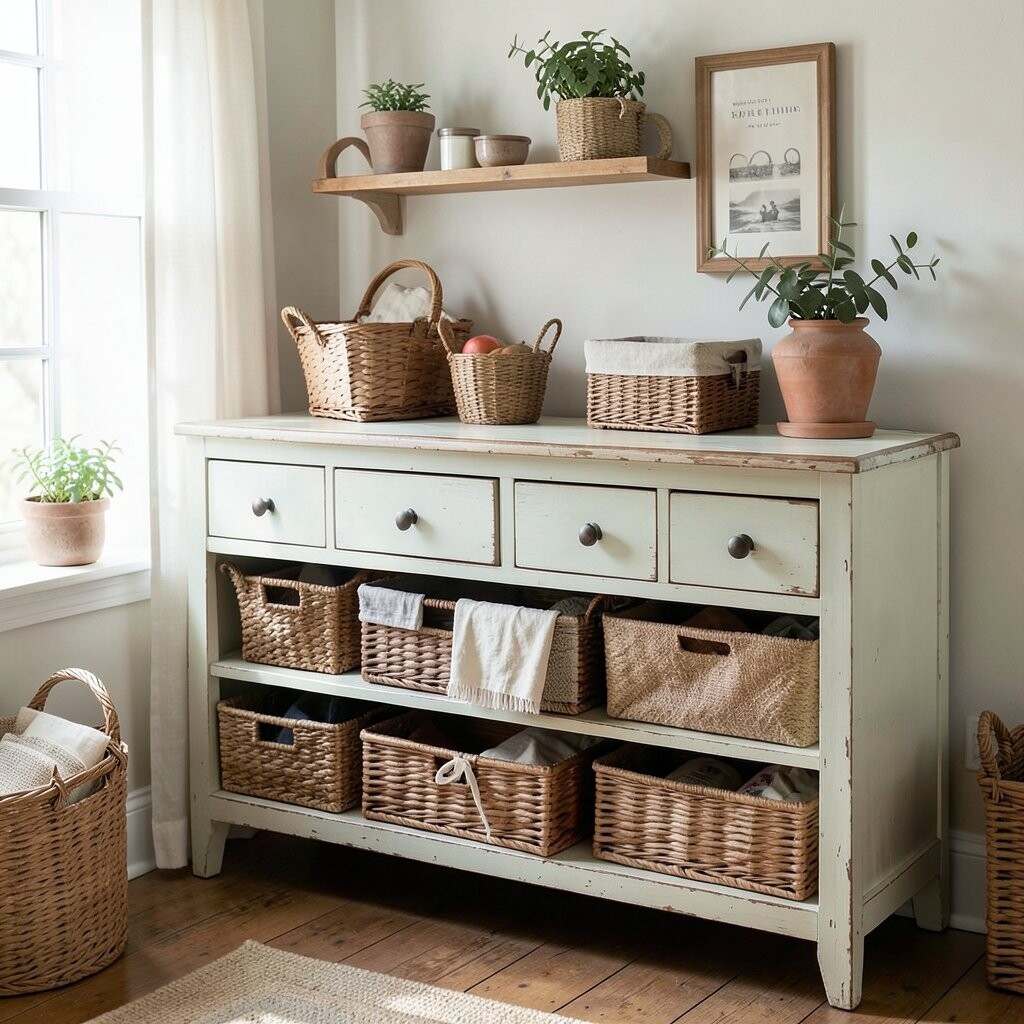 Baskets are versatile and can be moved around as needed. They also add a natural element to your decor. Look for baskets at thrift stores to find unique and affordable options.