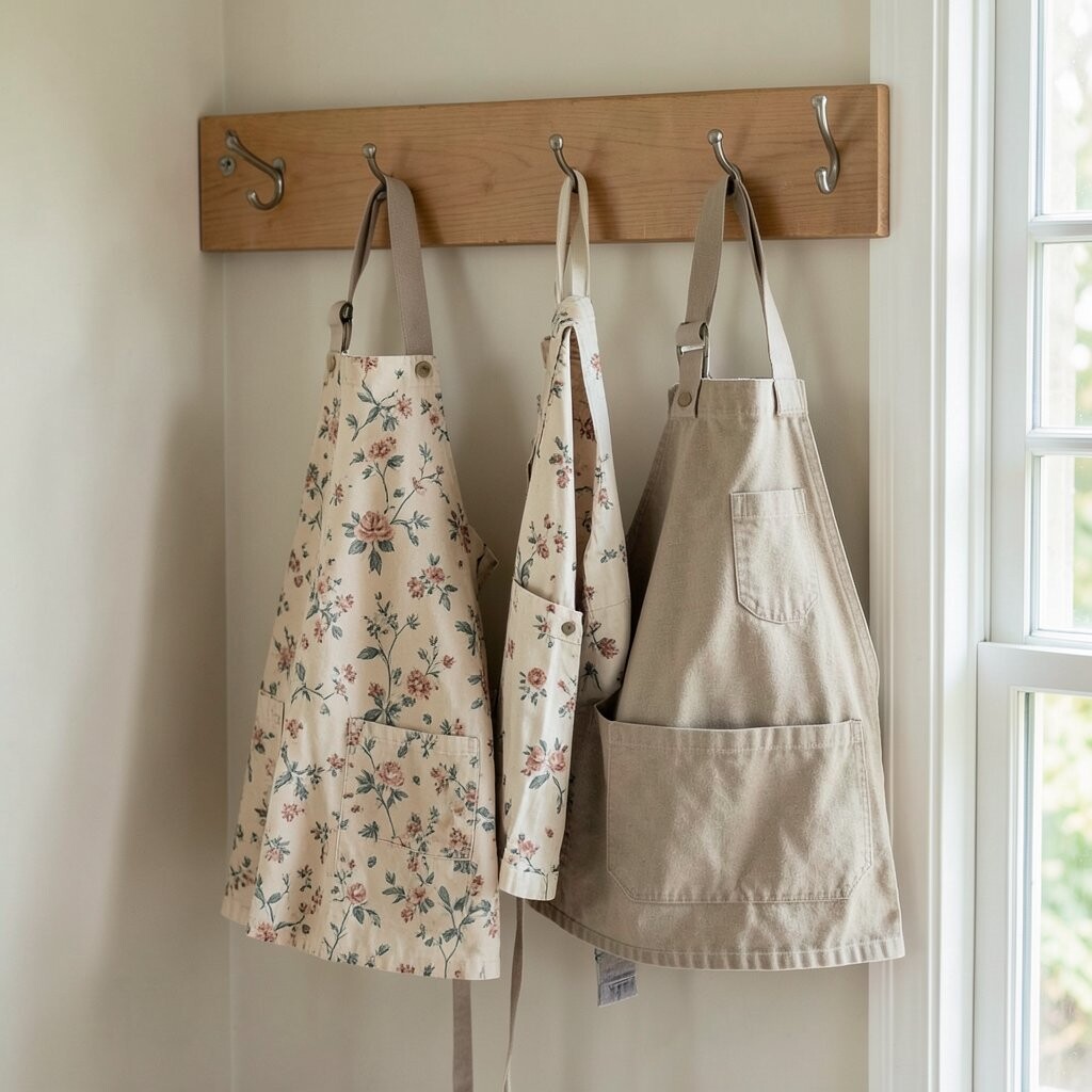 A decorative wall rail can hold aprons with S-hooks or clips. Install it above a countertop or near your stove for easy access. This setup is both practical and stylish.