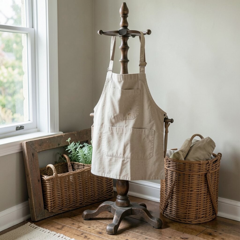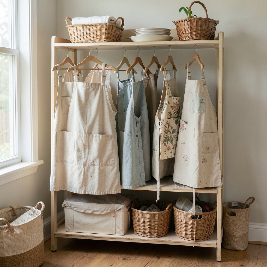 An antique coat stand can double as an apron holder, providing a vertical storage option. Place it in a kitchen corner for a charming display. It’s an unexpected but delightful way to organize your aprons.
