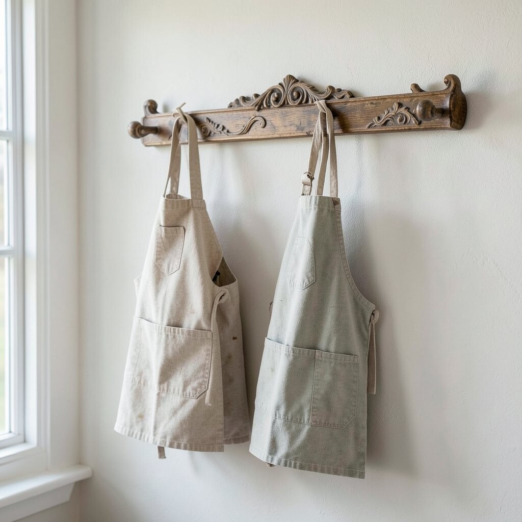 Install a collection of vintage hooks on a kitchen wall or inside a pantry door. Each hook can hold an apron, turning your storage into a decorative feature. Look for hooks with different styles to add personality.