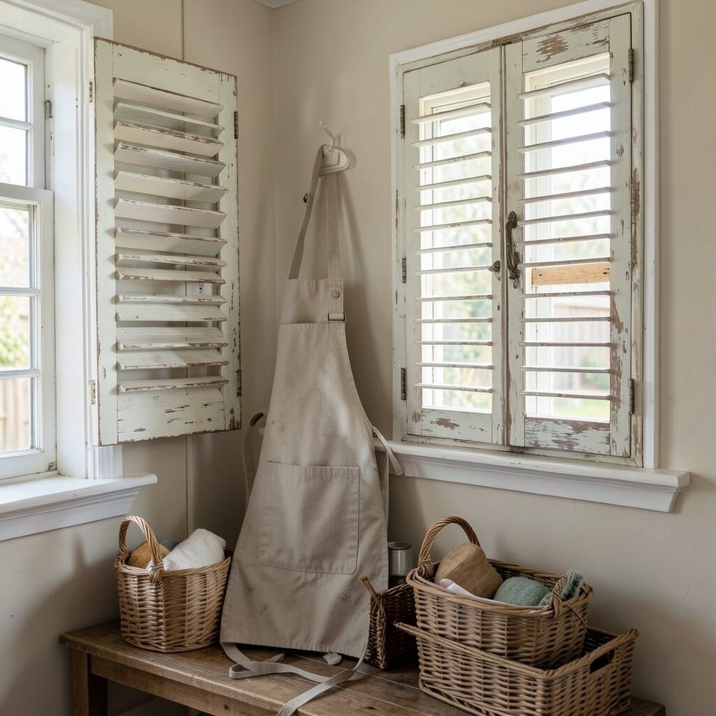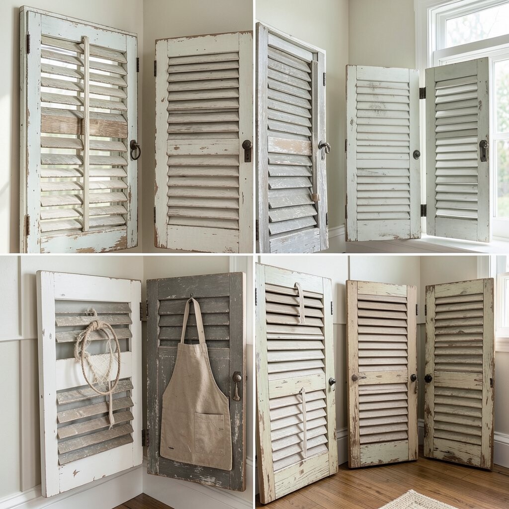 Shutters bring a rustic charm and can be painted or distressed. They’re often available at salvage yards or antique shops. It’s an affordable way to organize while adding vintage flair.