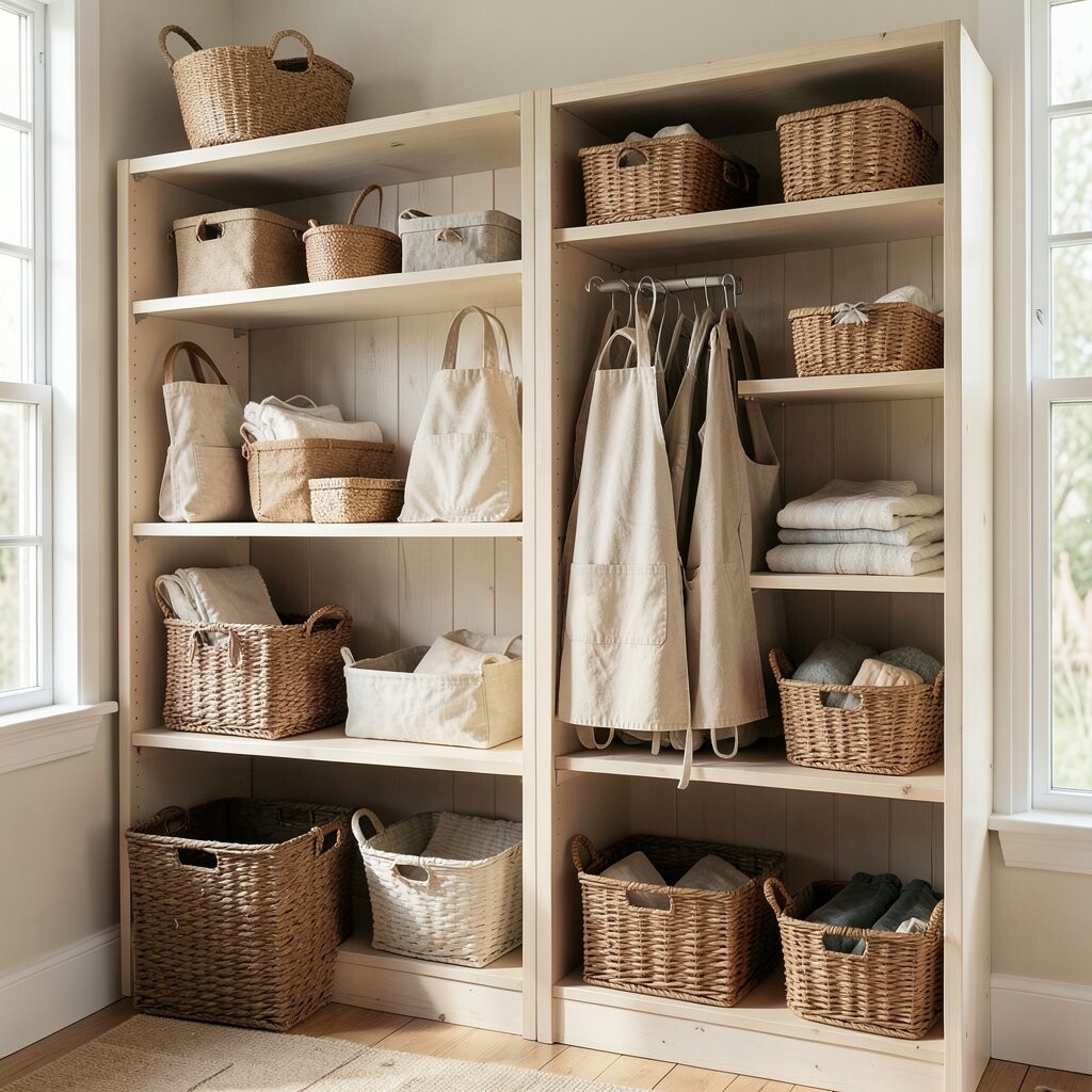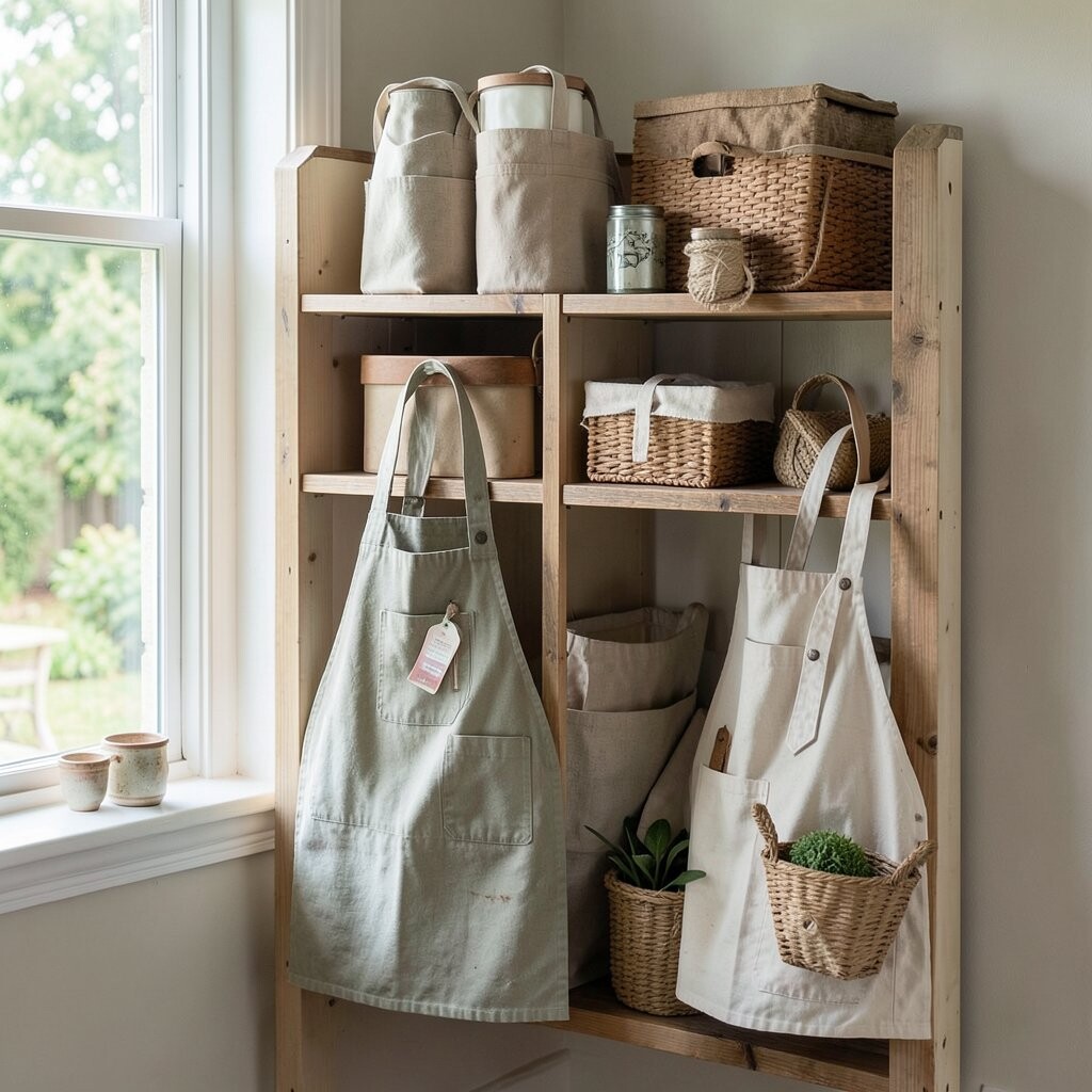 Use open shelves to fold and display aprons neatly. Stack them by color or pattern for a visually pleasing effect. This method keeps aprons in sight and within reach.