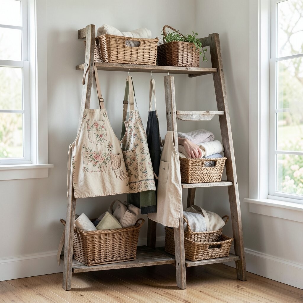 A ladder shelf with a shabby chic finish provides a unique storage solution. Hang aprons on hooks or fold them on the shelves. This idea combines functionality with a touch of elegance.
