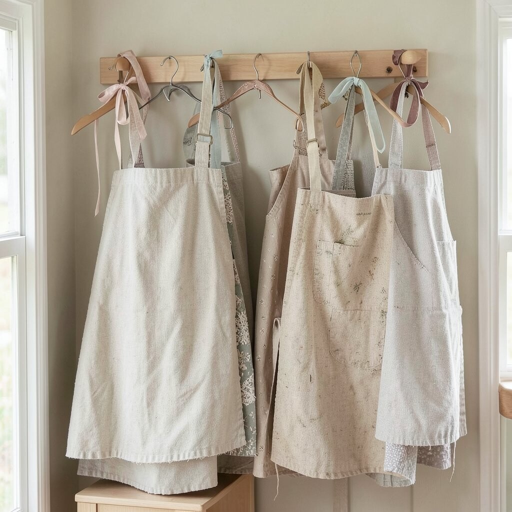 Collect vintage hangers to hang aprons in a closet or on a rod. Choose hangers with unique designs to add character. This method keeps aprons wrinkle-free and ready to wear.