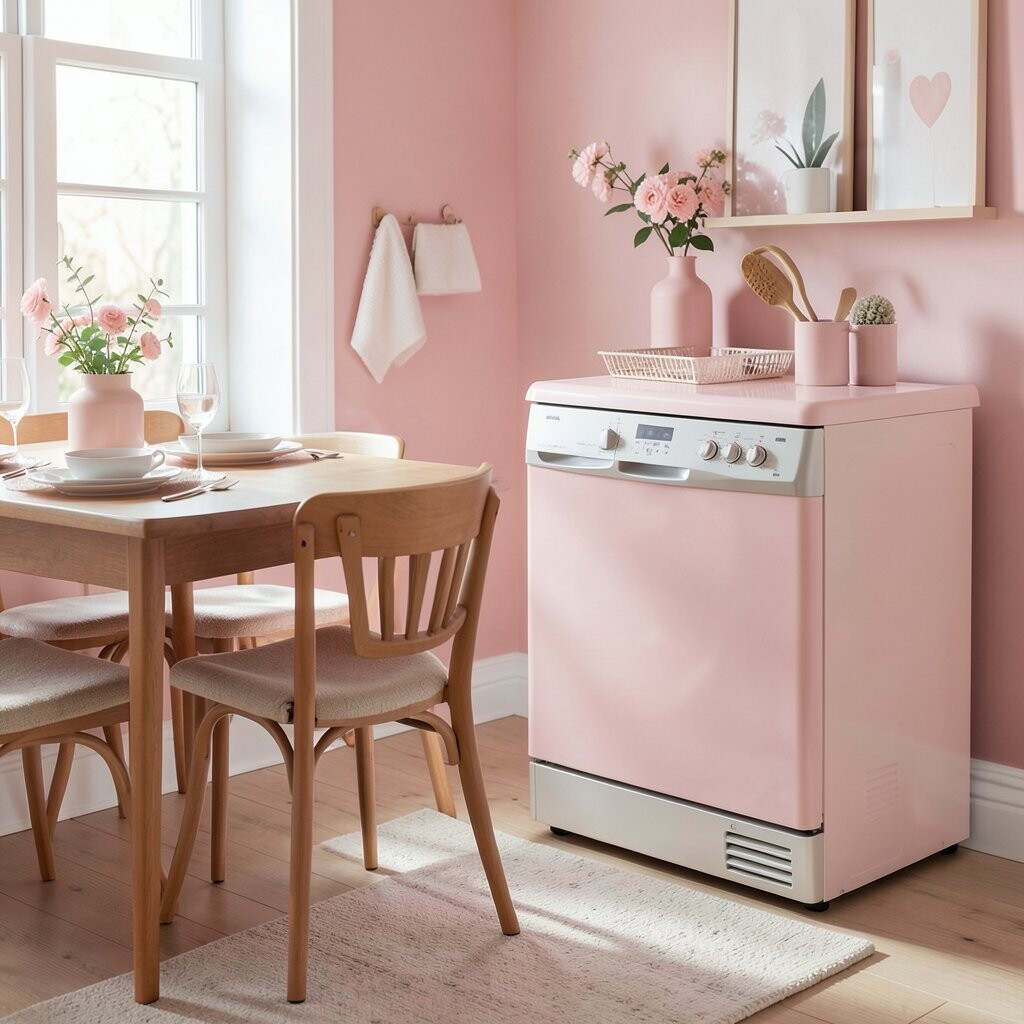 A soft pink dishwasher adds a sweet, unexpected touch. It feels charming and a little fancy, like a favorite vintage dress.
