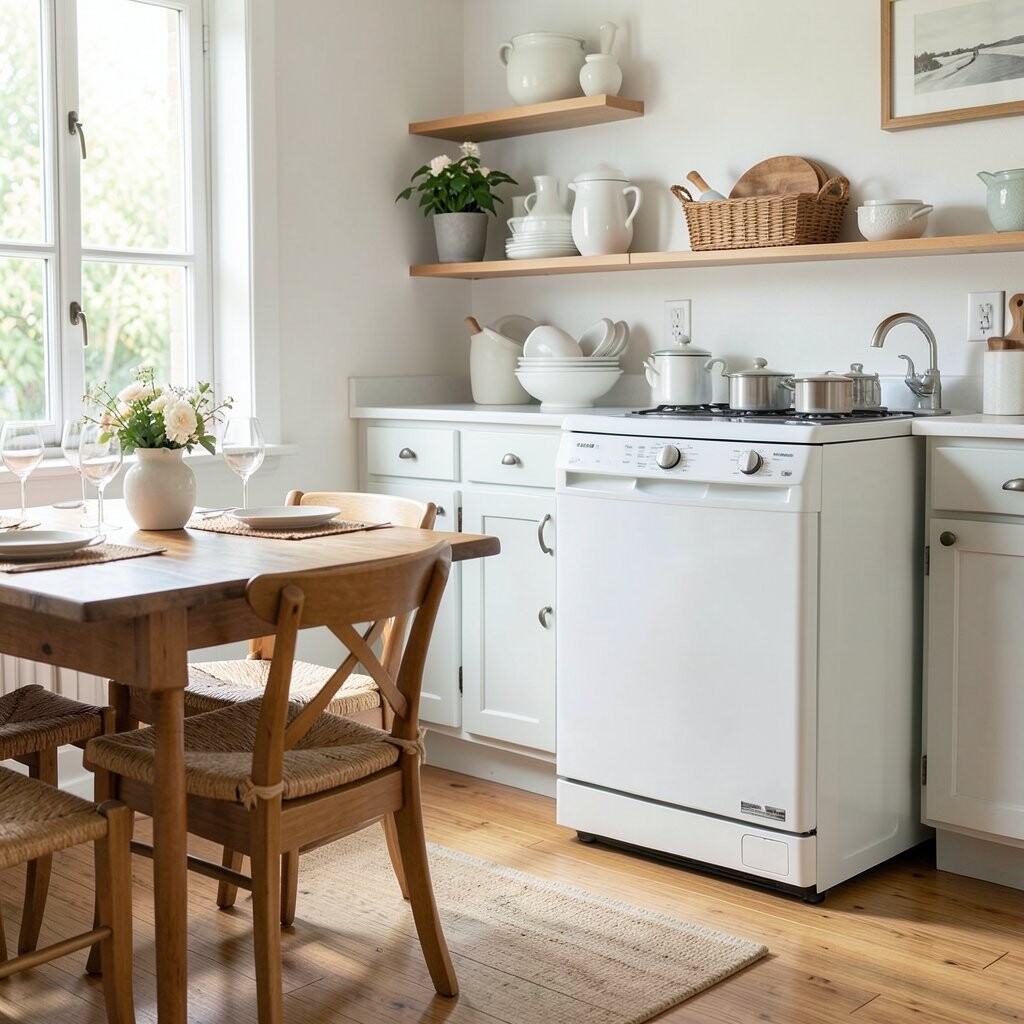 A vintage dishwasher styled with lace accents nearby can feel very romantic. Think soft curtains, delicate plates, and little touches that look hand-loved.
