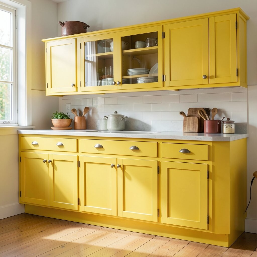 Sunny yellow cabinets add a bright, cheerful glow to the room. They feel like a happy nod to mid-century style and can wake up a plain kitchen fast.