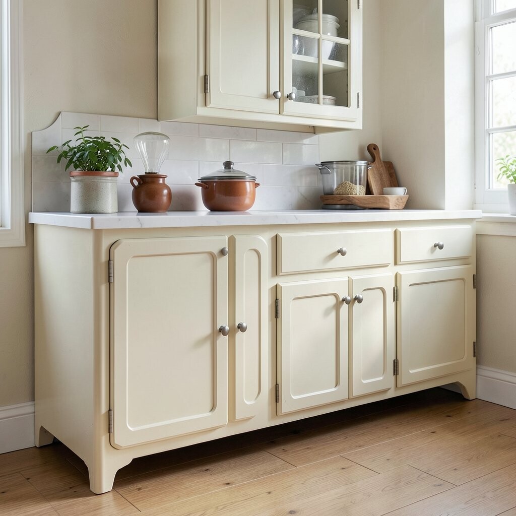 Cream enamel gives a soft, cozy look that feels like a sunny old diner. Chrome handles add shine and make the whole cabinet feel crisp and neat.