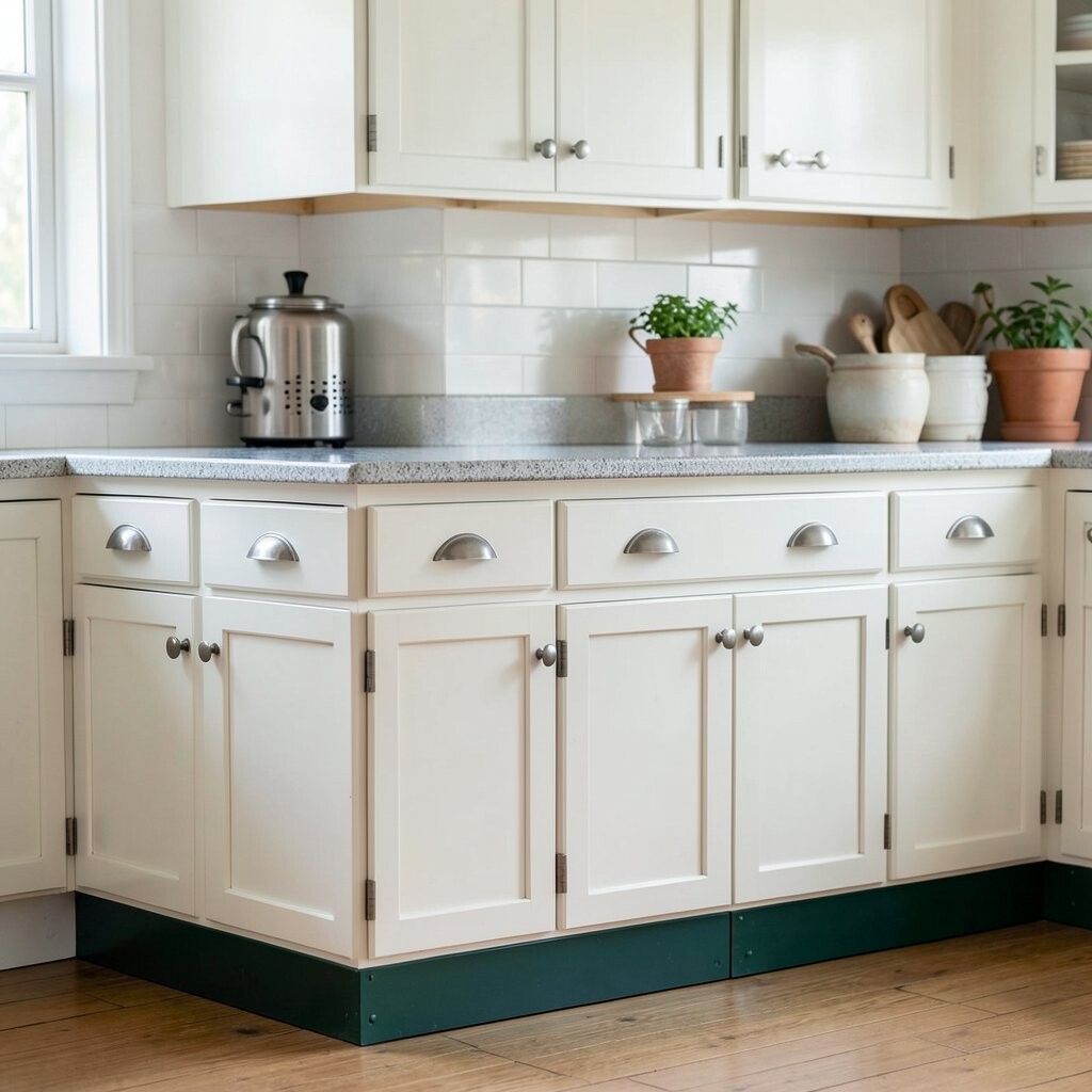 Try a soft blue, green, or red toe kick for a retro touch. This is a simple and low-cost way to make plain cabinets feel more special.
