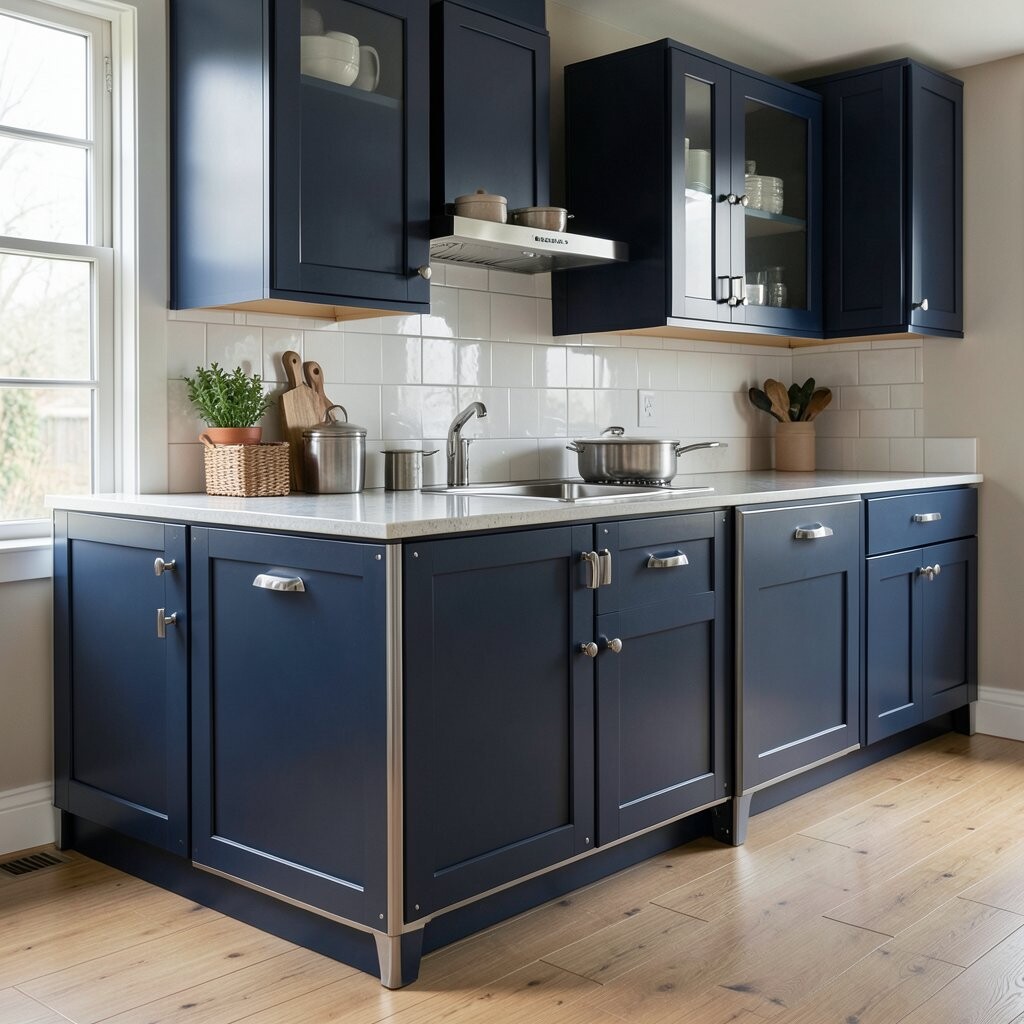 Navy blue metal cabinets feel classic and strong. Polished steel accents keep the look crisp and give it a little shine.