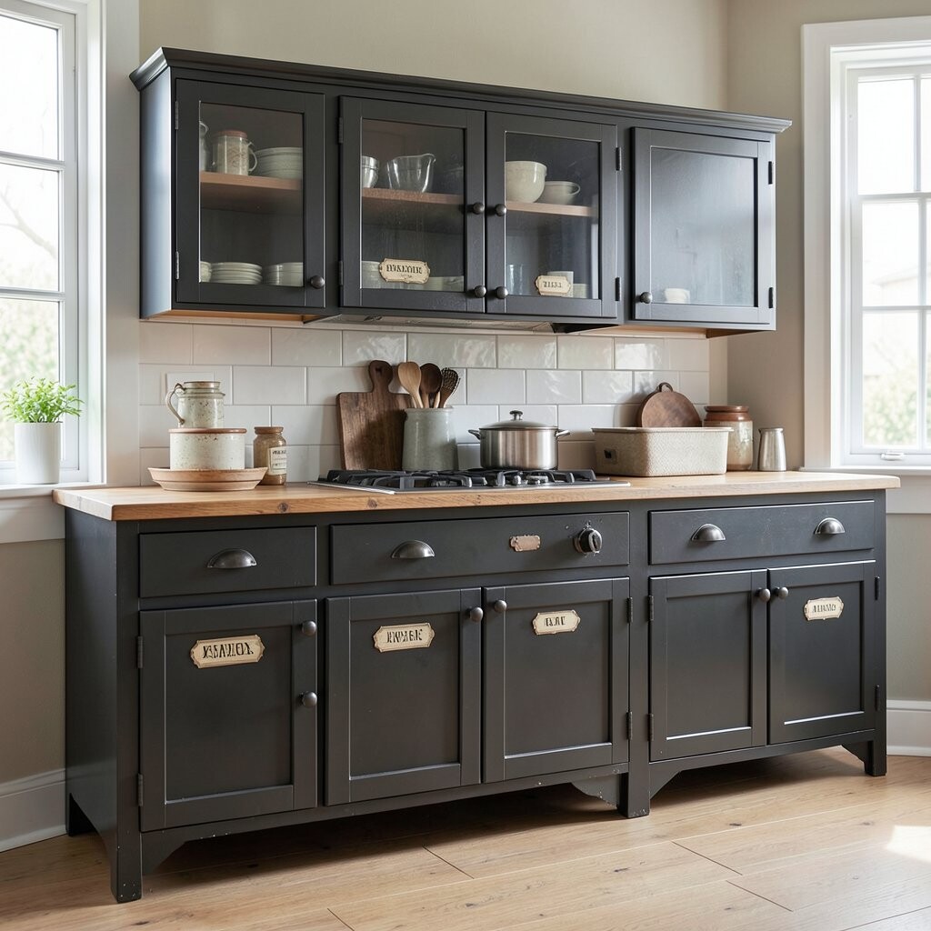 Charcoal cabinets bring a deep, cool look that feels strong and stylish. Vintage labels on drawers or doors add a fun old-kitchen touch.