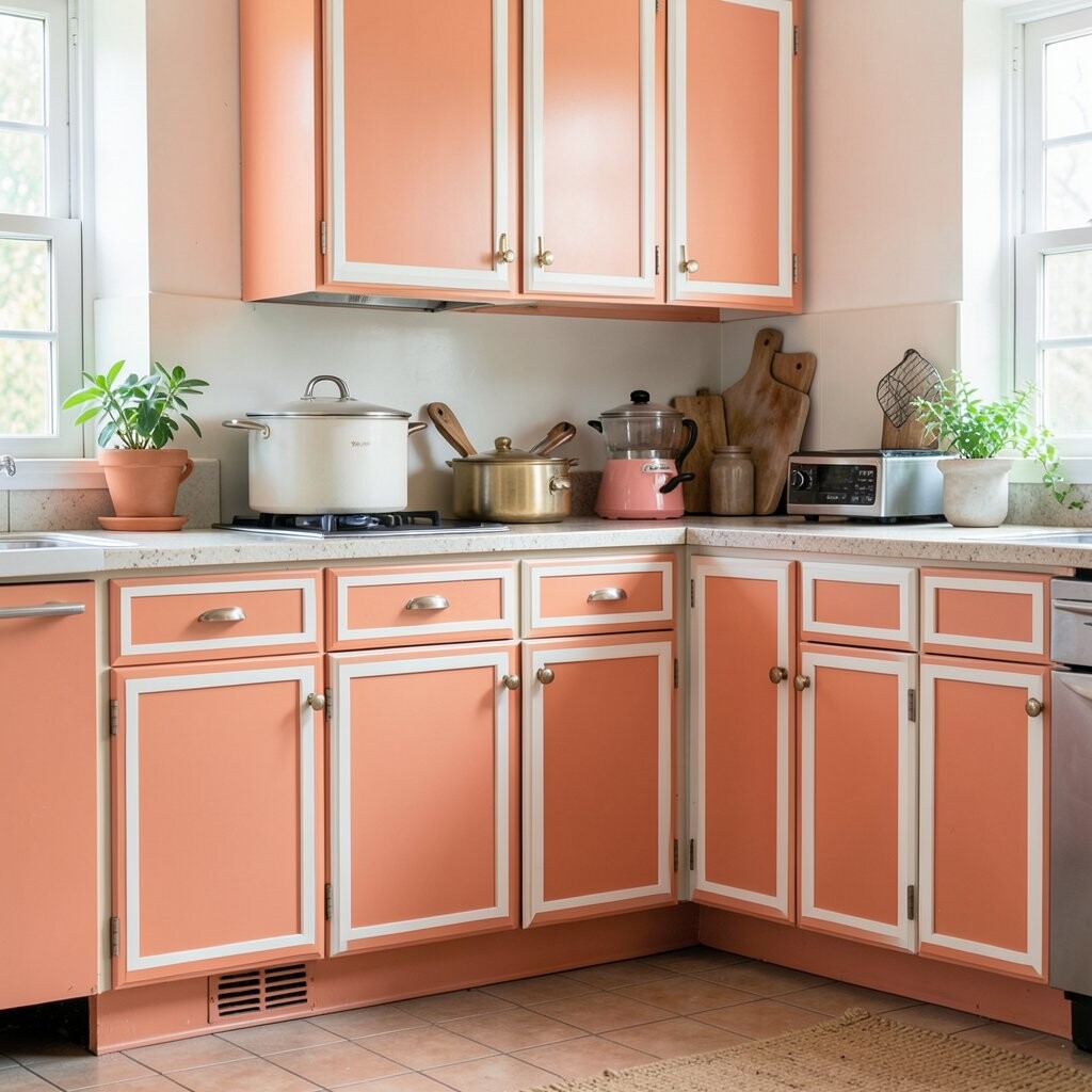 Coral cabinets bring a fun pop of color that feels warm and cheerful. Retro white borders make the shape look crisp and playful.