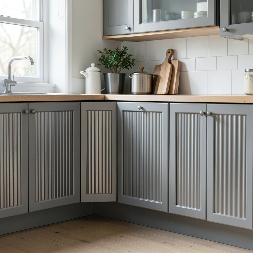 Soft gray cabinets with ribbed metal texture feel subtle but interesting. The texture adds depth and makes the cabinets look richer up close.