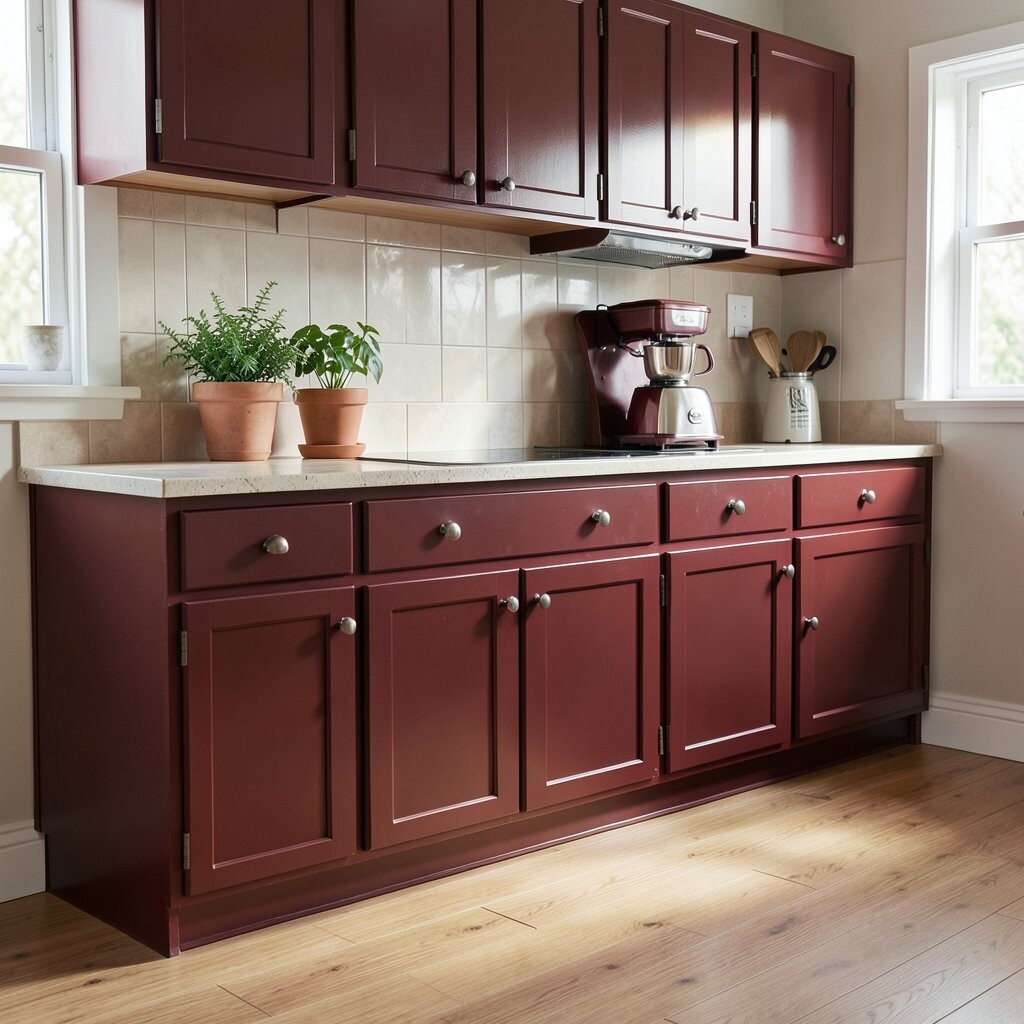Deep red metal cabinets bring strong color and a fun old-fashioned feel. They stand out fast and make the kitchen feel bold and warm.