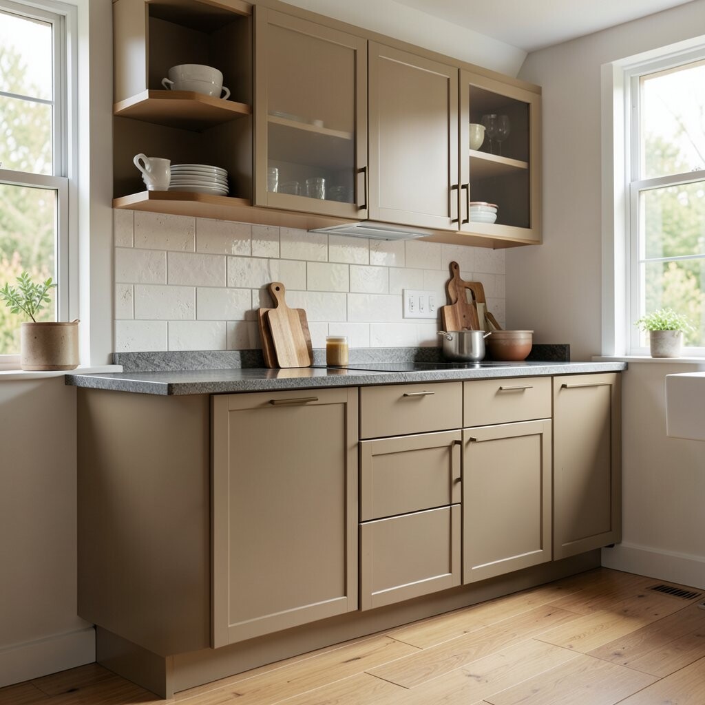 Warm taupe cabinets give a calm, smooth look that feels easy to live with. Mid-century lines make them look clean and a little sleek.