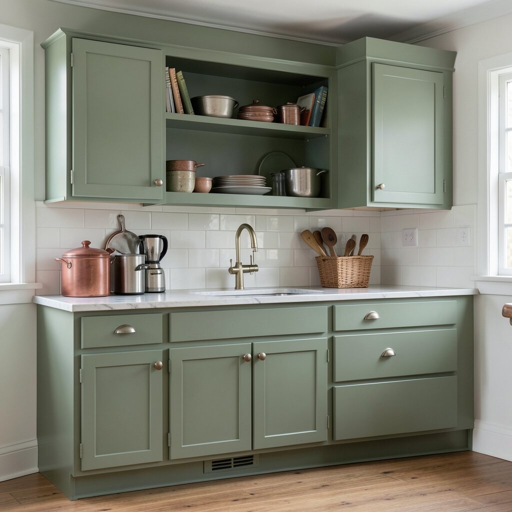 Sage green cabinets create a soft, calm mood that feels fresh and earthy. Open shelving above them helps the kitchen feel light and easy.