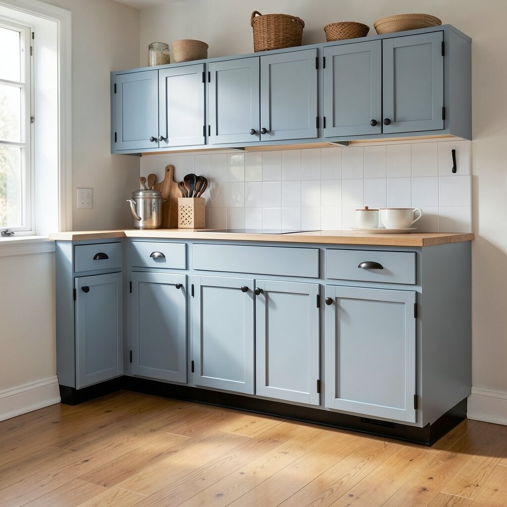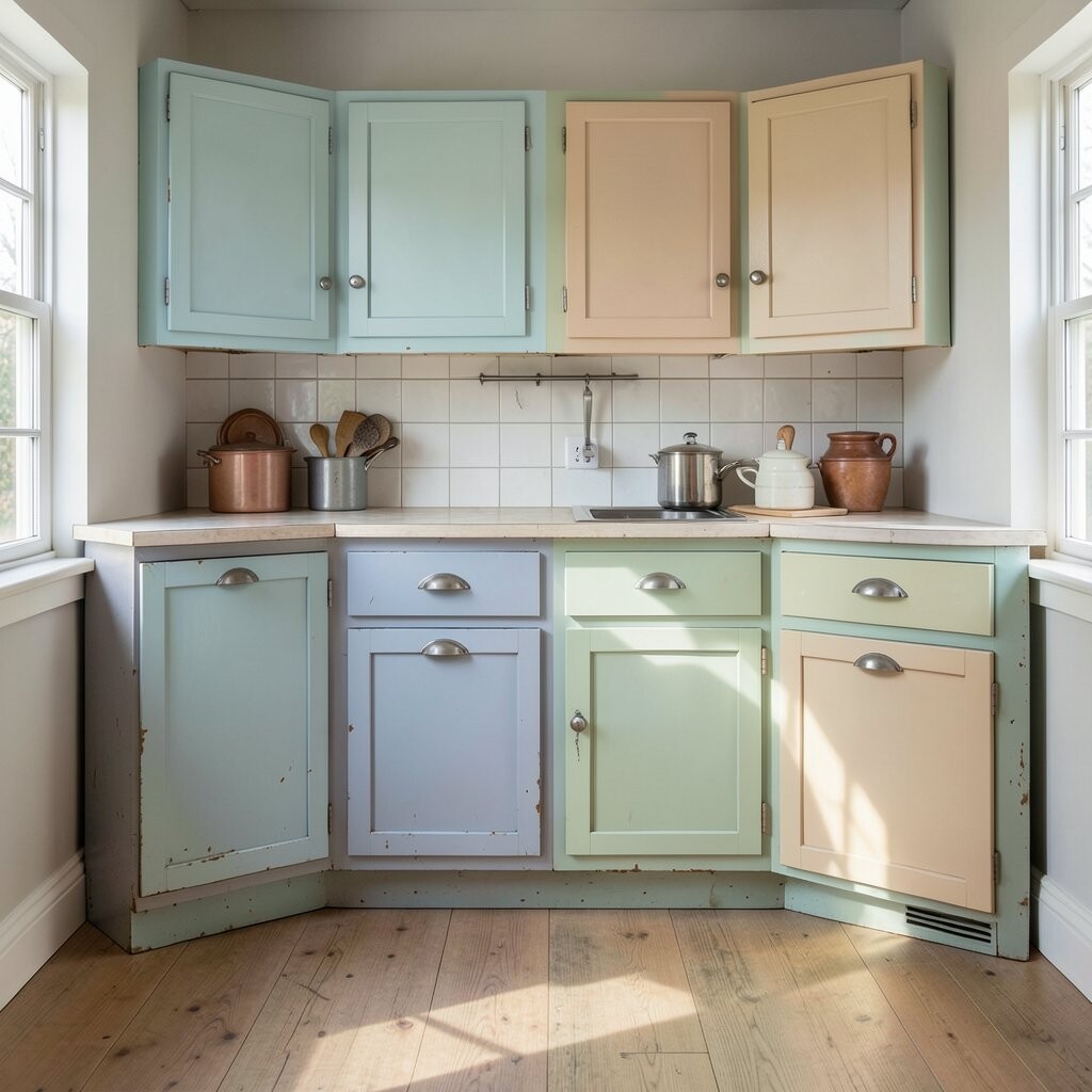 Pick one soft color for the doors and one neutral color for the frame. This style can be affordable if you paint what you already have instead of replacing everything.