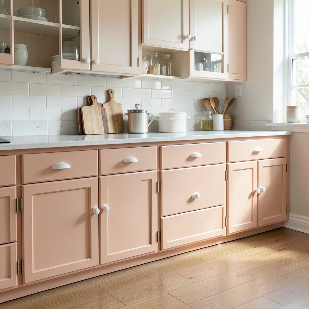 Peach metal cabinets feel sweet, warm, and a little playful. White hardware softens the look and keeps it light and cheerful.
