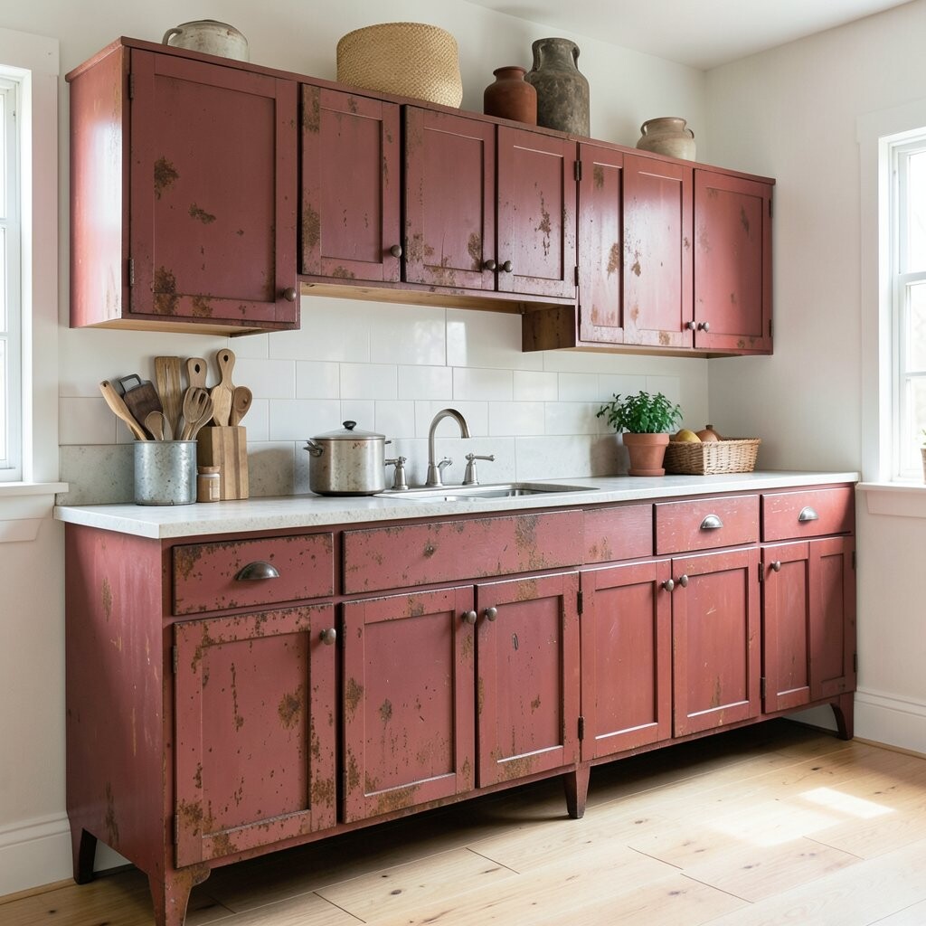 Rusty red metal cabinets with a distressed look feel full of history. They bring a warm, lived-in charm that feels honest and homey.
