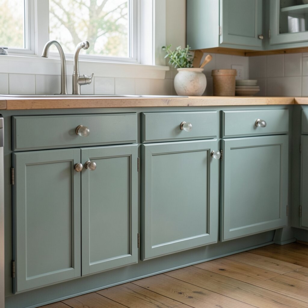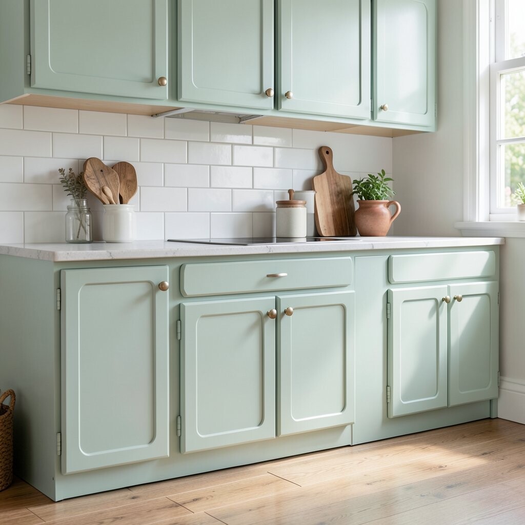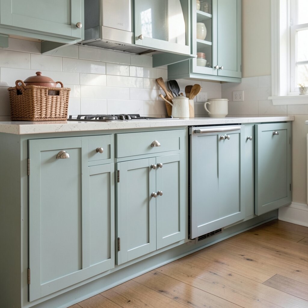 Soft mint cabinets bring a sweet vintage mood that feels clean and cheerful. Rounded edges make them look friendly and old-school in the best way.