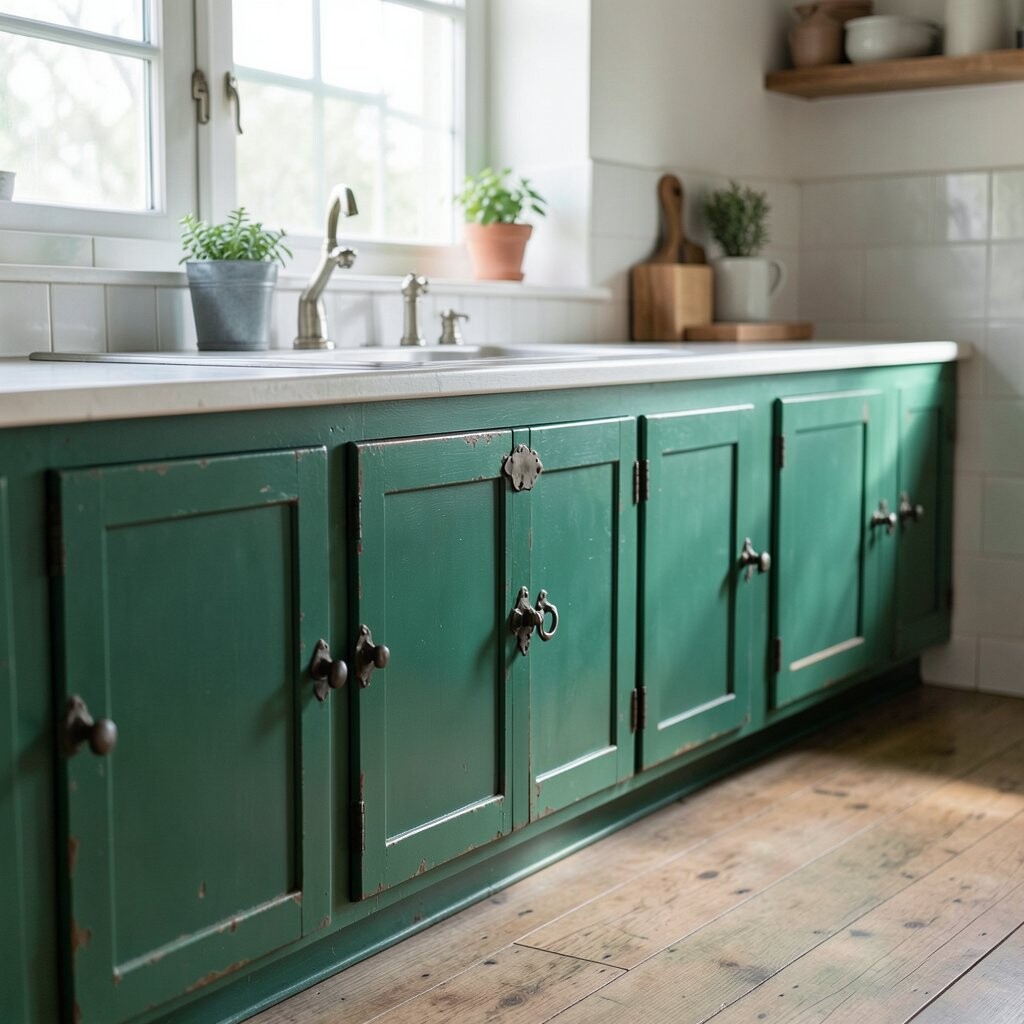 Emerald green cabinets feel rich, bold, and full of old-world charm. Old-style latches add a true vintage feeling that stands out.