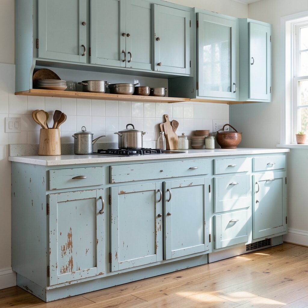 Pair them with old-style labels, enamel mugs, or a vintage bread box. Distressed finishes can be done on a budget, especially if you already have older cabinets to work with.