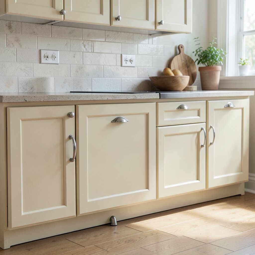Buttercream cabinets feel soft, sweet, and inviting. Rounded corners make them look extra vintage and easy on the eyes.