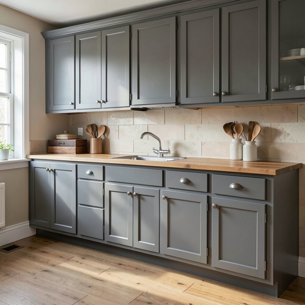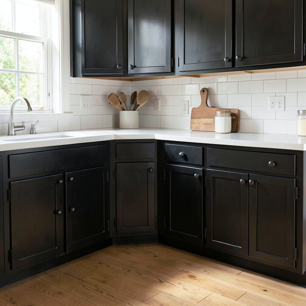This choice works well if you want a kitchen that feels cozy and a little moody. It looks beautiful with cream walls and butcher block counters.