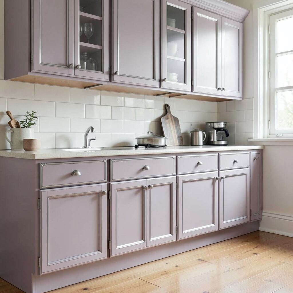 Pale lavender cabinets bring a soft, dreamy feeling that feels unusual in a good way. Silver accents keep the look fresh and a little fancy.