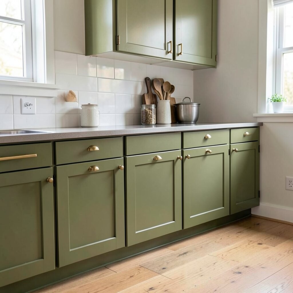 Olive green metal cabinets give a rich, earthy vintage feel. Brass pulls add warmth and make the color look even more elegant.